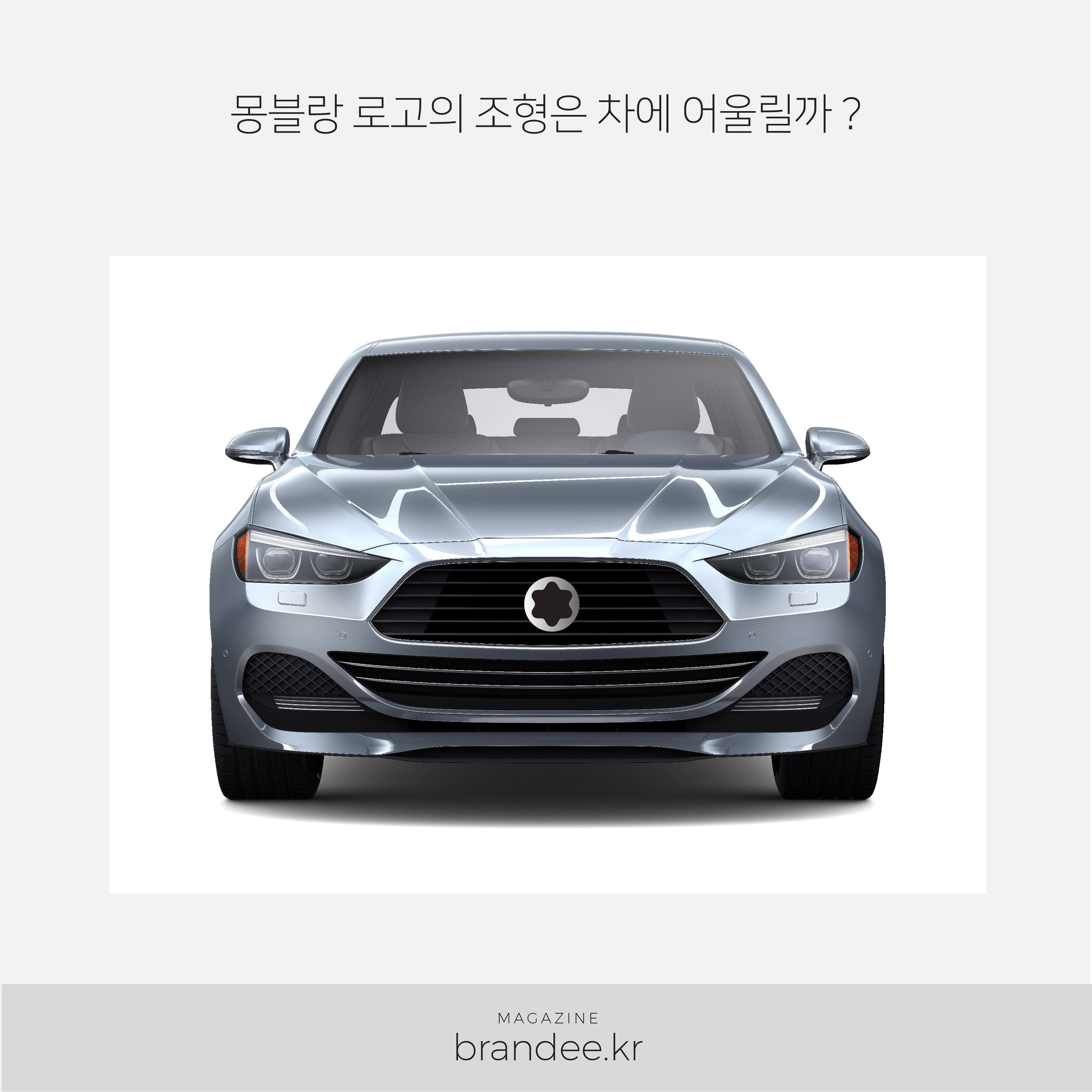 그렇다면 다른 분야의 제품 브랜드 로고를 자동차에 붙여보면 어떤 느낌일지가 궁금하다. 비교하기 쉽게 대칭형의 몽블랑 마크와 비대칭인 나이키 로고를 자동차에 붙여 보자. 좌상향으로 치켜 올라가는 움직임이 있는 나이키 로고보다는 아무래도 시각적 무게 중심이 정중앙에 있는 몽블랑이 더 안정감 있게 보이지 않을까. 각가의 로고가 차 앞에 붙었다고 상상해보자. 나이키는 차도 엠블럼도 움직여 조금 산만한 반면, 몽블랑은 차는 움직이더라도 엠블럼은 차의 정중앙에서 무게를 딱 잡고 버티고 있는 모습이라 차체와의 일체감을 더 강화해준다 .