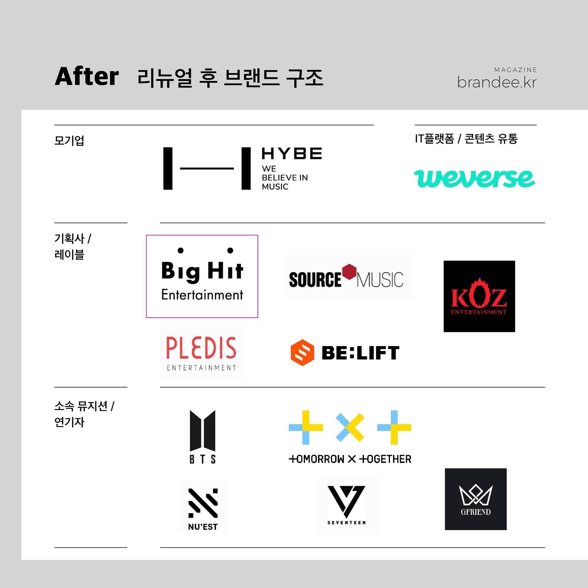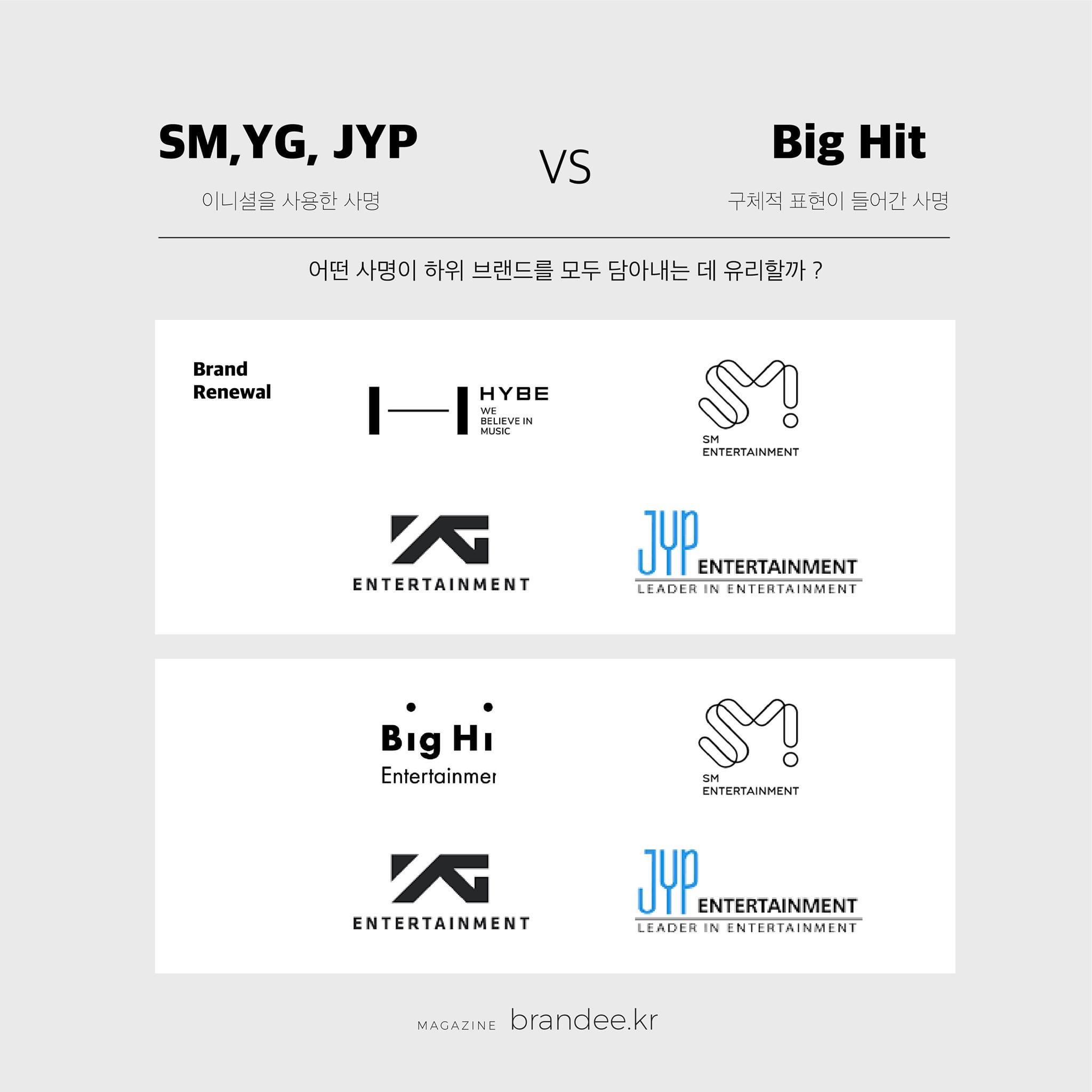 SM, YG, JYP로 사명을 지었을 때 이런 것까지 어느 정도 염두해 두지 않았을까도 싶다. 그에 비해 BigHit의 이름은 거기까지는 생각하지 못했던 것 같다. 산하의 레이블이 이렇게나 많아지고 사업 영역도 전세계를 상대로 할지 상상이나 했을까? 어쨌든 이름 때문인지 ‘빅히트’한 그룹이 나온 건 성공적인 브랜딩이다.
