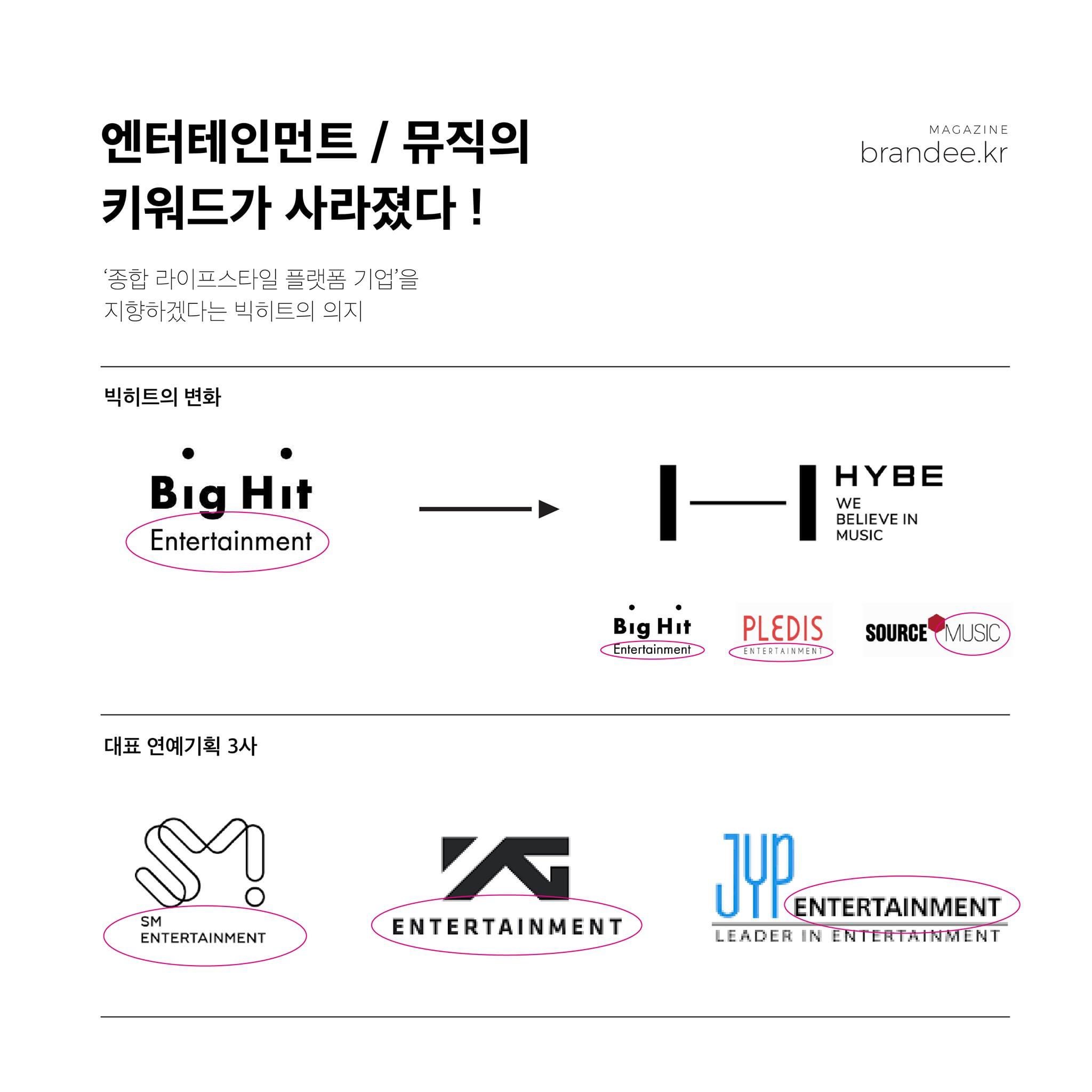 BigHit에서 HYBE로 바꾼 이유늘 브랜딩의 관점에서 분석해보려고 한다. 우선 당연한 변화처럼 보인다. 앞서 말한 기획사들의 브랜드 포트폴리의 구조와 미래 사업 비전을 담아내기에는 BigHit라는 그릇은 턱없이 작아 보인다. 더구나 ‘히트’ 그룹이나 가수 발굴, 제조사가 아니라, ‘플랫폼’ 기업으로 도약하겠다는 비전을 생각하면 더더욱 그렇다.