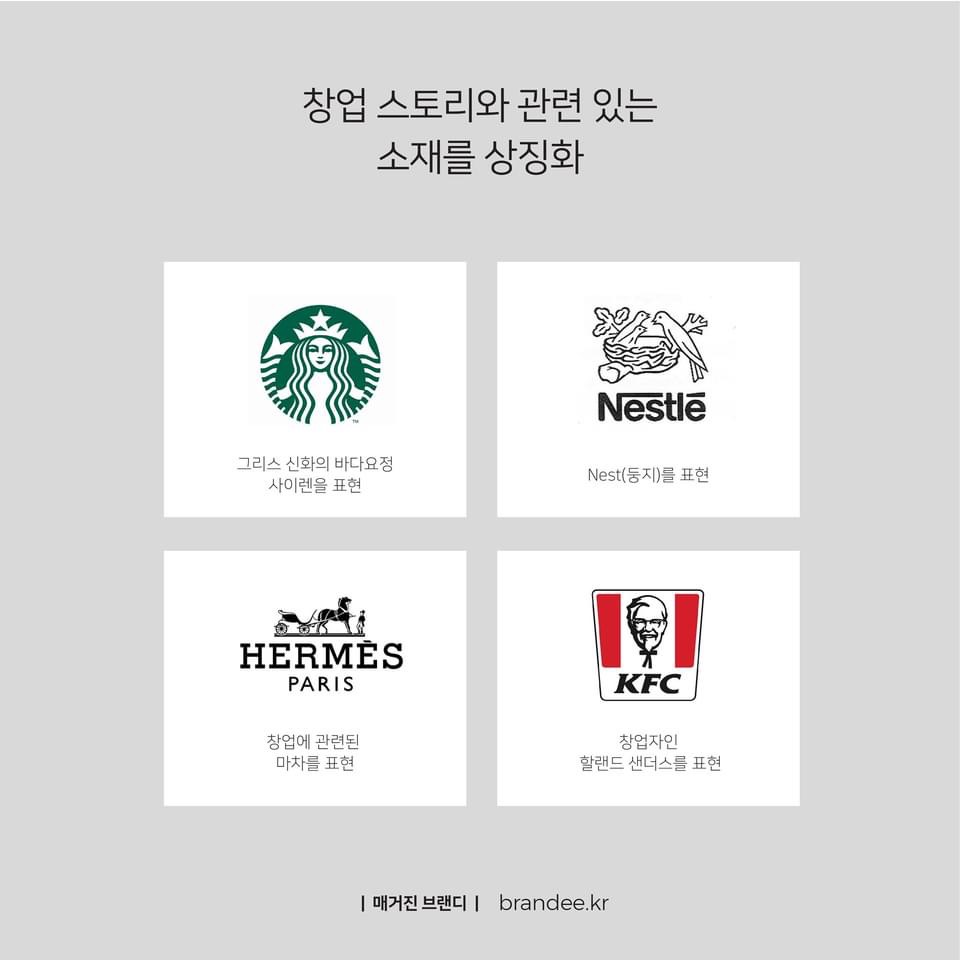 글로벌 식품회사인 네슬레는 창업자인 네슬레의 이름을 딴 Nest(둥지) 마크를 상징화했다. 이는 안전, 모성애, 애정, 자연, 가족적인 가치를 표현한 소재다. 특히 창업 초기 대표 제품이 유아식이었던 걸 생각하면 브랜드의 강점을 적절하게 잘 담아낸 상징이다. 켄터키 프라이드 치킨의 줄임말인 ‘KFC’는 창업자인 할랜드 샌더스 중위의 모습을 상징화한 캐릭터와 마크를 사용한다. KFC와는 직접 관련이 없어 보이지만 창업의 스토리와 역사성을 잘 효과적으로 표현하고 있다. 스타벅스는 소설 백경에 나오는 일등 항해사 '스타벅'에서 모티브를 얻었다고 한다. 이와 연관된 바다의 요정인 ‘사이렌’을 표현 요소로 사용해 상징화한 건 너무나 자연스럽다. 창립자의 이름을 쓴 에르메스도 창업 초기의 판매 제품이었던 말 안장과 마구 용품을 상징하는 ‘마차’의 상징을 사용했다.