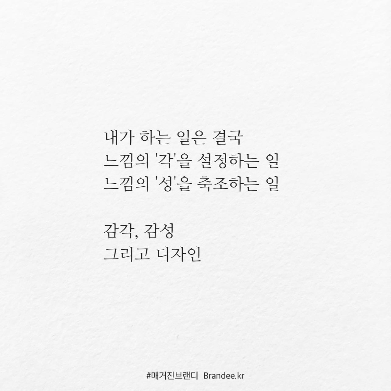 결국 디자인을 하는 일이란 ‘느낌’과 가장 밀접하게 관련된 거 아닌가 싶습니다. 사람들의 감성적 요인을 연구하고, 그것들을 감각적인 요소들로 표현해내야 하니까요. 당연히 사람들의 행동과 마음을 끊임없이 관찰하고 분석하고 해석해내야 하죠. 그 걸 또 표현해내기 위해 다방면으로 연구해야합니다. 그러다가 말로만 설명하기 어려운 실체 없는 ‘느낌’을 발견하고, 표현하고 완성해 냈을 때의 기쁨은 말할 수가 없습니다. 이렇게 느낌의 각을 맞춰 설정하고, 느낌의 성을 축조하고 완성해 가는 일. 이 게 디자이너라는 감성 건축사가 하는 일이라고 생각하고 있습니다.