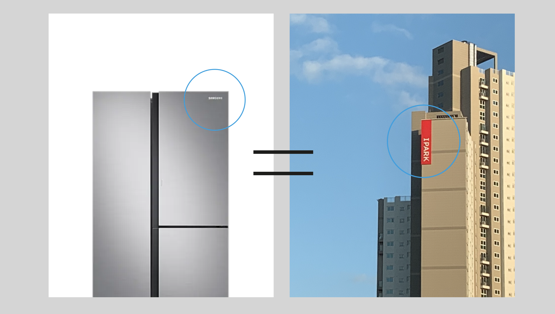 하나는 '이제 아파트도 정말 세상에서 가장 거대한 제품이구나'라는 생각이었습니다. 어느날 올림픽 대교를 건너다가 눈앞에 아파트 측면에 라벨처럼 붙은 'I PARK'의 빨간색 브랜드 로고를 보고 굉장히 인상 깊었습니다. 아파트 브랜드 로고가 마치 전자제품 모서리 한면을 자치하고 있는 제품 로고 같다는 느낌을 받았기 때문입니다. 그게 아파트처럼 키가 큰 냉장고나 에어컨같다는 착각도 들었어요. 그야말로 세상에서 가장 높고 크고 비싼 제품에 붙은 라벨같은 거였죠. 그러고 보니 브랜드 리뉴얼된 래미안 로고는 영문이 중심이라 그런지 'RAEMIAN'이라는 로고타입을 냉장고에 붙여도 그리 어색할 것 같지는 않습니다.