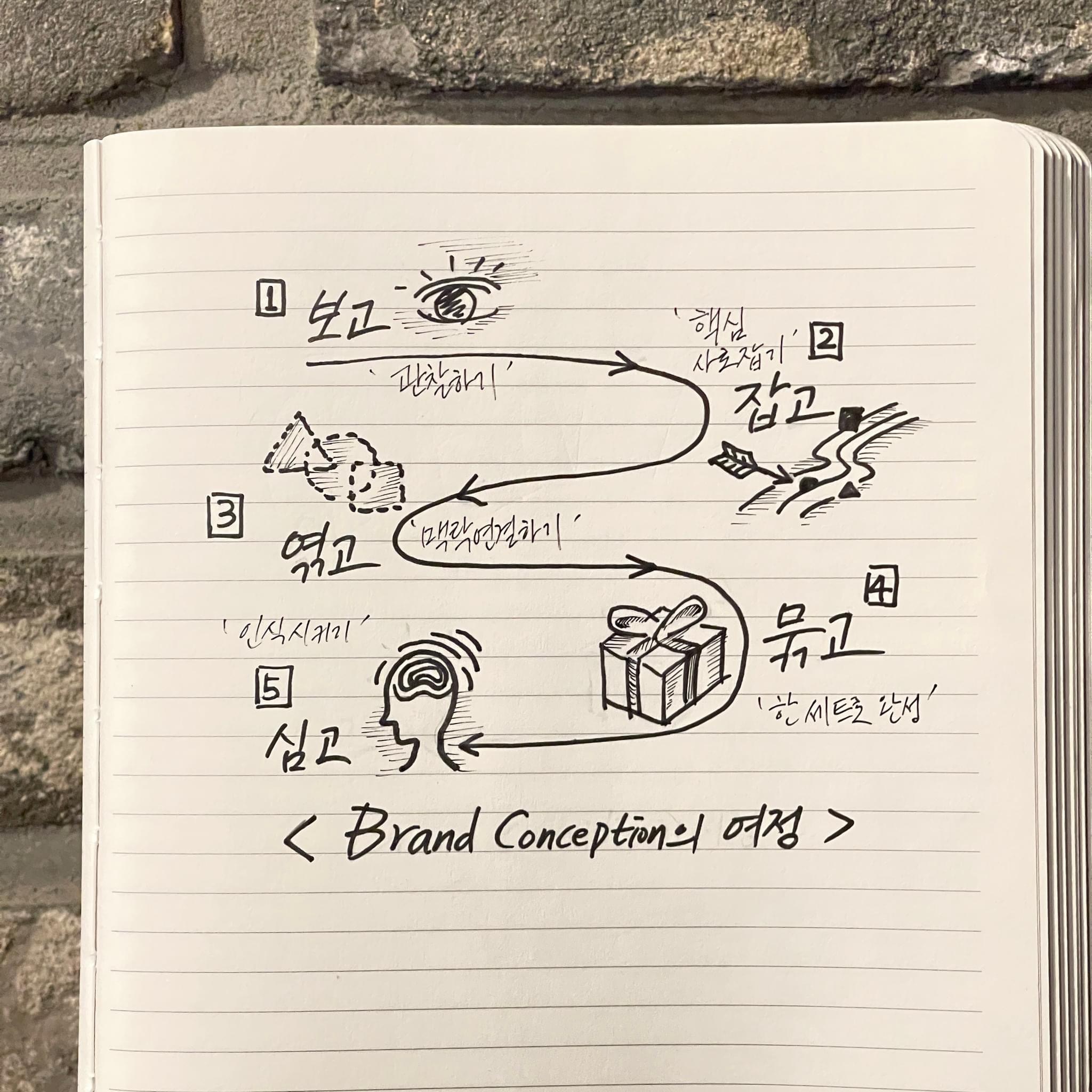 이렇게 다섯가지 코스로 브랜드가 컨셉을 잡아나가는 과정, 브랜드의 개념을 완성해 나가는 컨셉션의 여정을 설명해봤습니다.