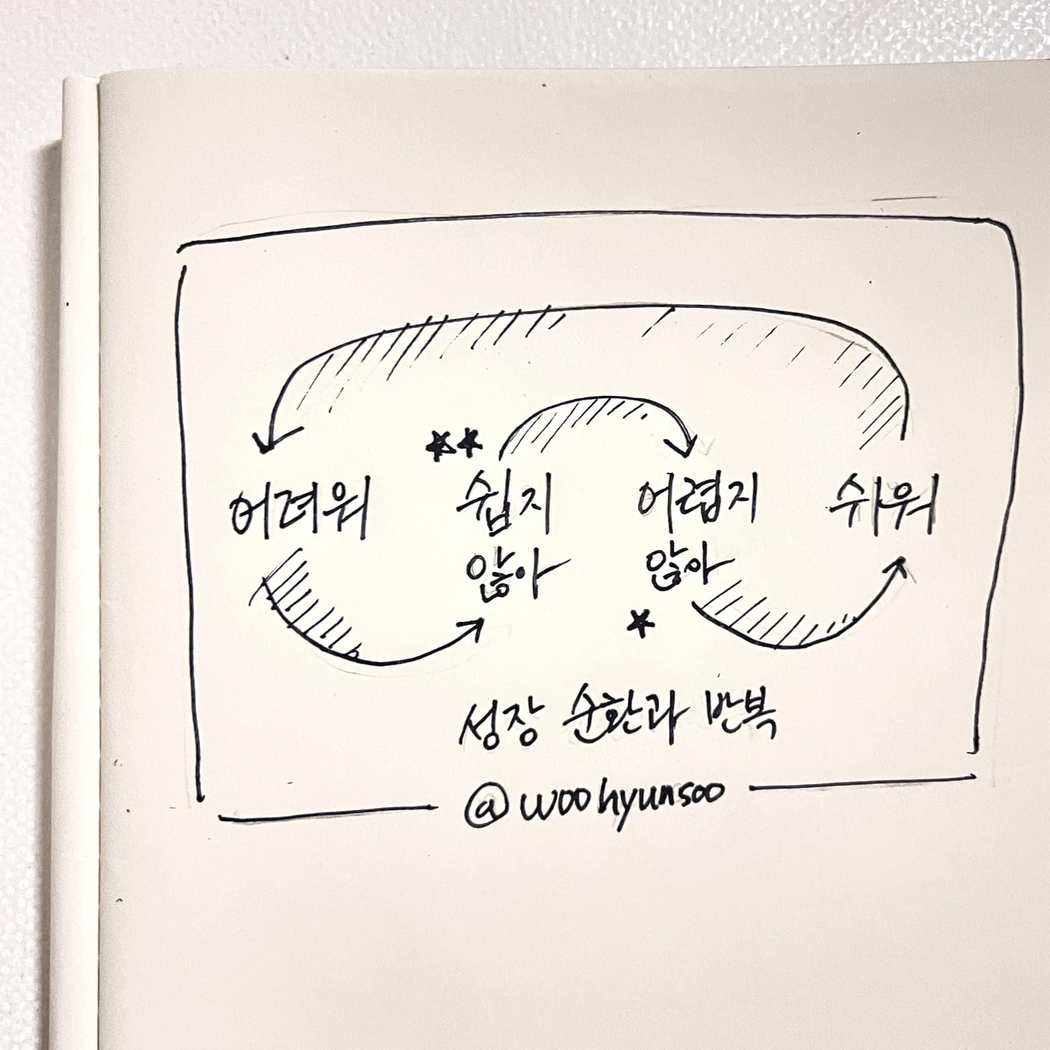 이러한 과정들의 순환과 반복은 성장 근육을 키워줍니다. 멈추지 않고 성장을 이어갈 수 있는 계기를 만듭니다. 그러니 지금하는 일이 더 이상 쉽지 않은 게 아니나 쉽기만 하다면 어렵지 않거나, 쉽지 않은 단계의 일을 찾아봐야하지 않을까 싶습니다. 쉬운 일만 반복할 게 아니라 약간 어려운 일, 생각보다 쉽지 않은 도전을 계속해가는 습관을 들여보아야겠습니다. 그렇게 포기할만큼 어렵거나 너무 쉬워서 지루하지 않는 일들 사이를 계속 찾아가다보면 그런 시간이 쌓이다보면 어느 순간 더 괜찮은 내가, 더 나은 내일이 찾아올 거라 생각합니다