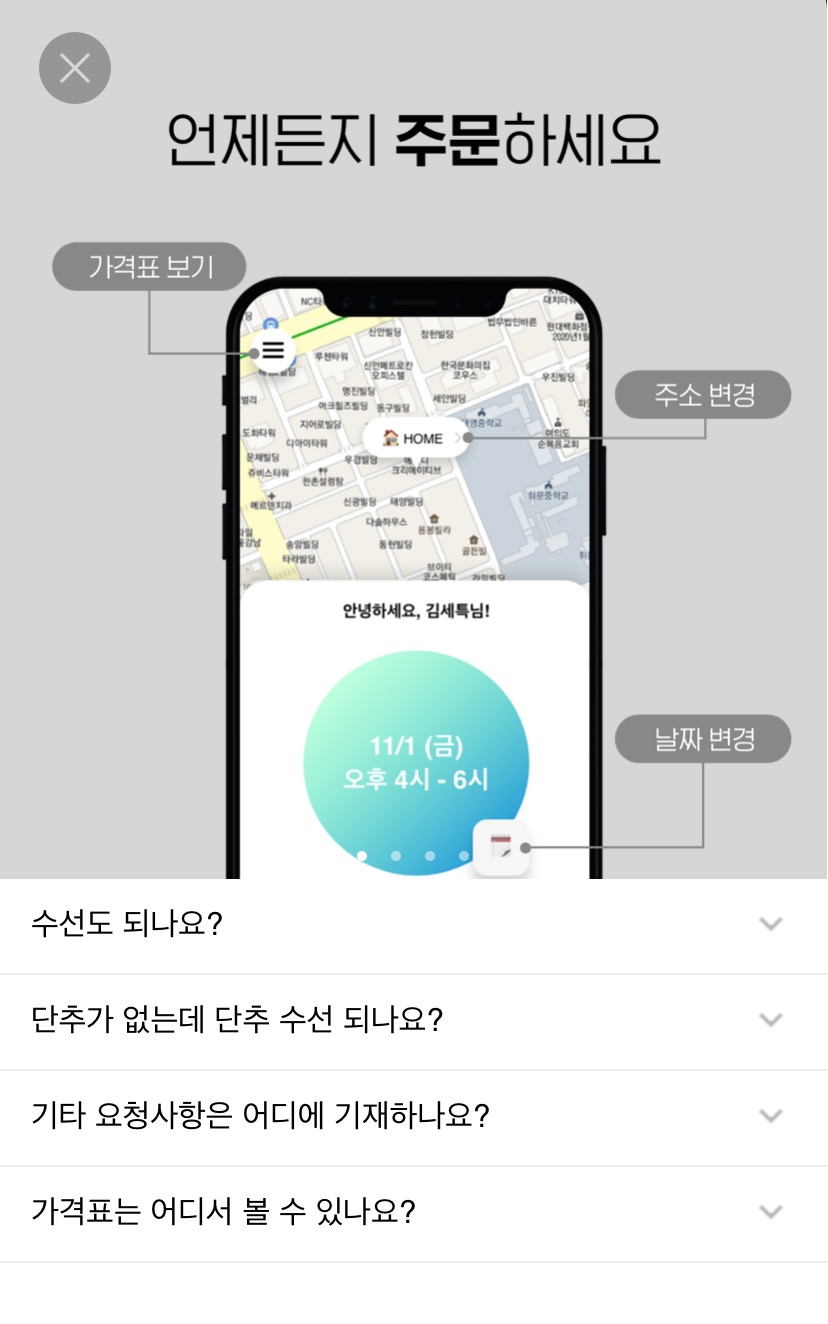 세탁특공대 앱의 특성은 채팅에 익숙한 사용자들이 좋아할만하게 친철하게 잘 만들어졌습니다. 일단은 문체부터가 구어체로써 채팅을 하듯 친근한 느낌을 줍니다.