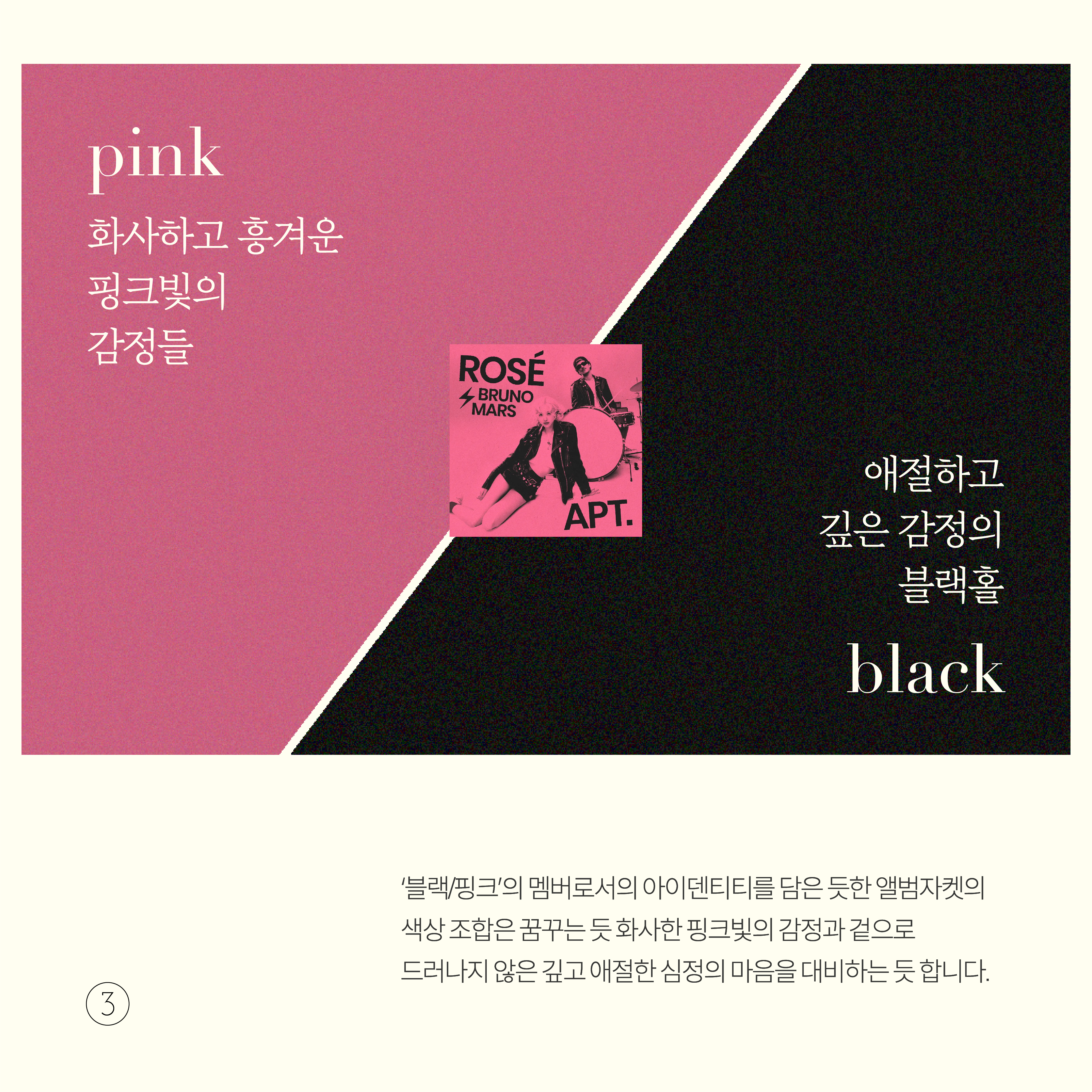 '블랙/핑크' 멤버로서의 아이덴티티를 담은 듯한 앨범자켓의 색상 조합은 꿈꾸는 듯 화사한 핑크빛의 감정과 겉으로 드러나지 않은 깊고 애절한 심정의 마음을 대비하는 듯 합니다.