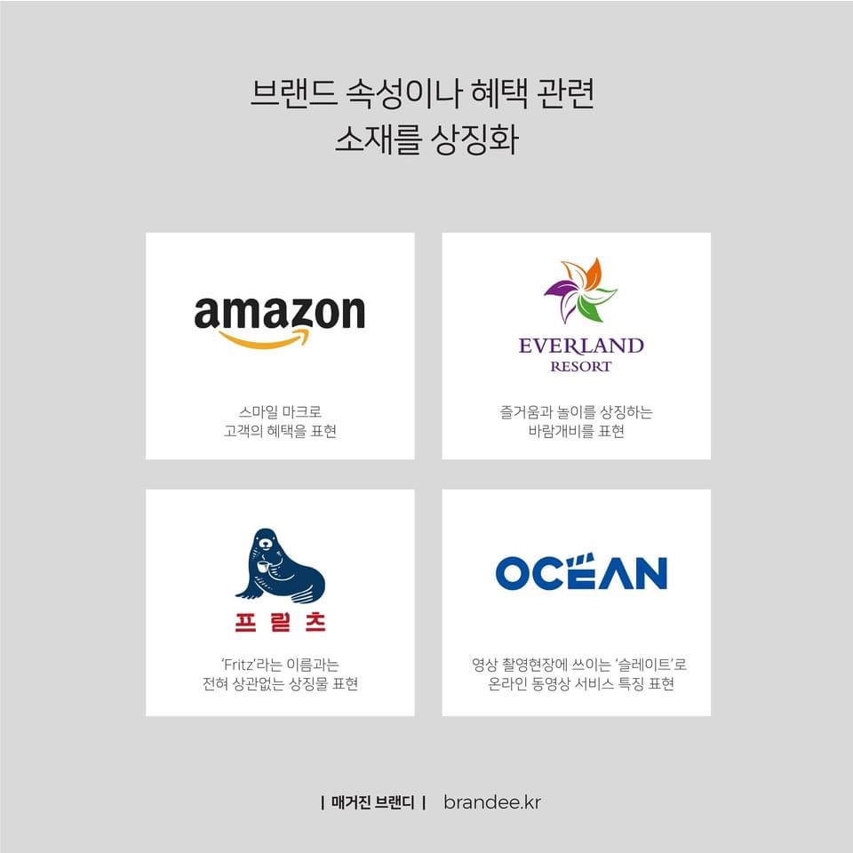 글로벌 대형 온라인 마켓인 Amazon에는 우리가 상상하는 아마존이 없다. 이 이름은 애초에 브랜드 네임에 아마존강의 거대함과 풍부함의 상징성을 끌어왔기 때문이다. 아마존 밀림이나 강을 표현하는 건 오히려 고객들에게 오해를 불러일으킬 것이다. 결과적으로 아마존의 상징은 구매의 즐거운을 표현한 스마일 표시가 중심 이미지가 됐다. SK브로드밴드의 ‘오션’이라는 브랜드는 넷플릭스처럼 최신 영화 및 인기 해외드라마를 제공하는 OTT(온라인동영상서비스)다. 마크 어디에도 대양은 없다. 깊고 푸른 빛의 색감 정도가 대양의 이미지를 대신하고 있다. 대신 영화 촬영장의 ‘슬레이트’라는 도구를 상징화해 브랜드의 속성을 표현했다. 또한 에버랜드에도 ‘랜드’라는 이미지가 없다. 대신 놀이의 즐거움을 상징하는 바람개비를 상징화했다. 에버랜드를 방문해 얻는 고객의 최종 혜택을 표현한 상징이다.
