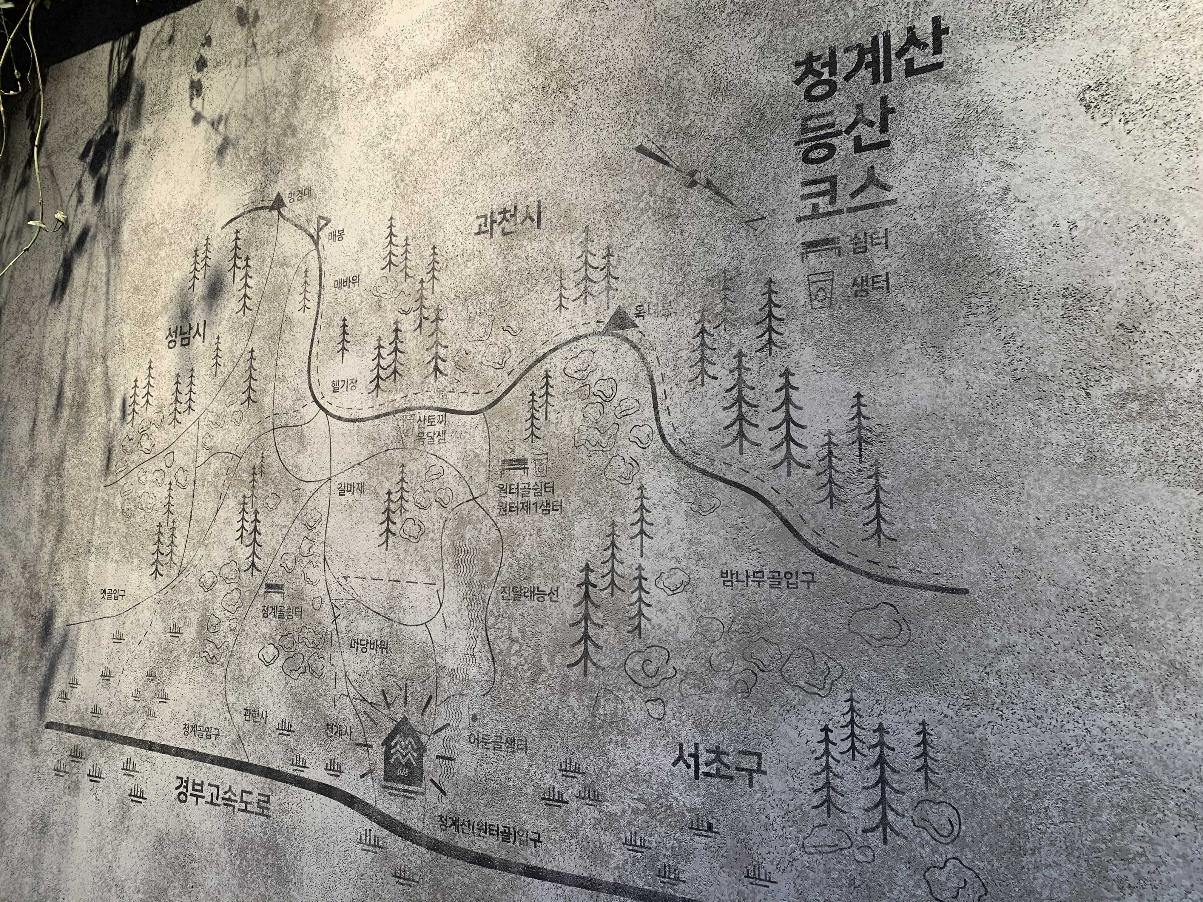 등산코스가 벽에 벽화처럼 그려졌다. 이런 크라프트한 감성이 이 공간의 개성을 더욱 강하게 만든다.